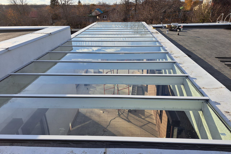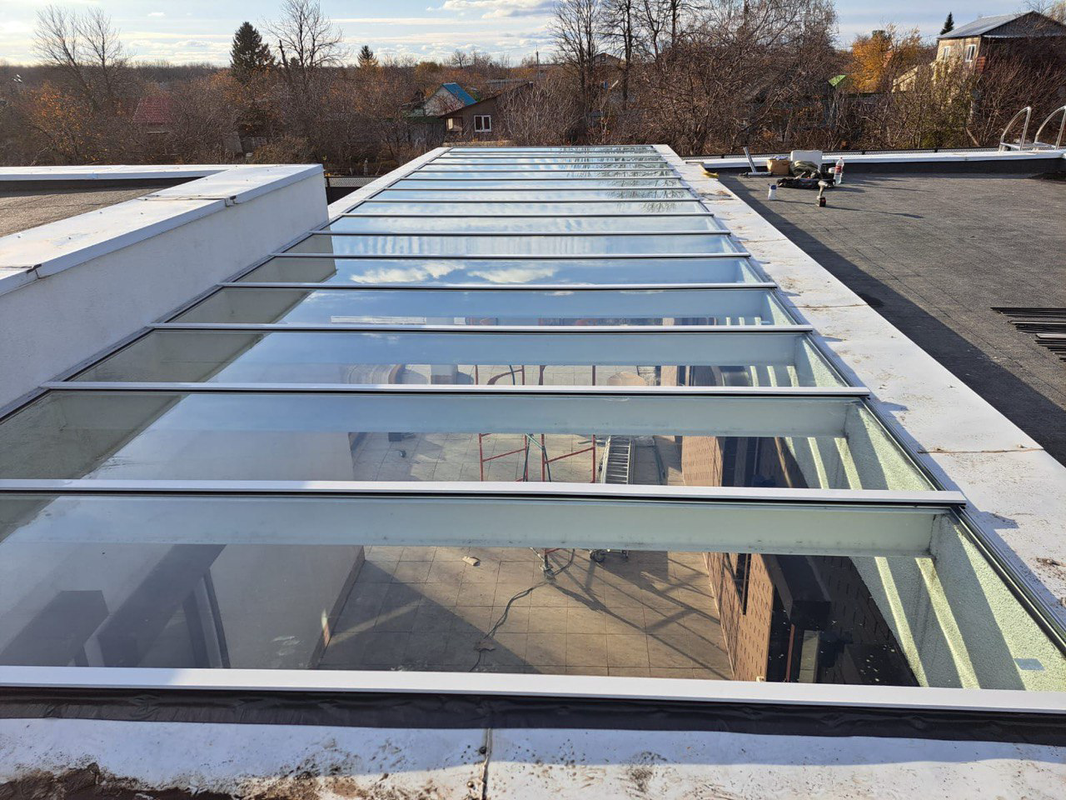 Был выполнен полный цикл работ — подготовка основания, монтаж несущего каркаса, установка стеклянных секций и герметизация примыканий к мягкой кровле.