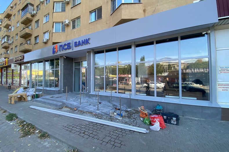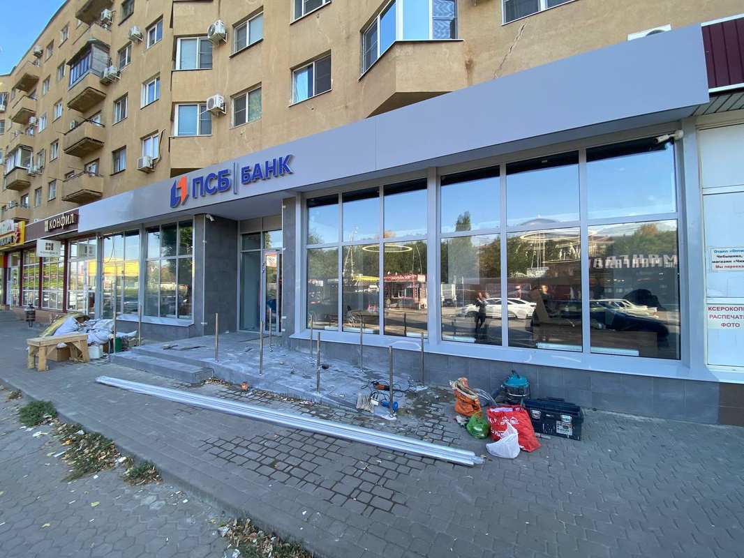Комплексное фасадное остекление нового отделения ПСБ Банка выполнено с использованием надежных алюминиевых профилей и энергоэффективных стеклопакетов. Проект включал полный демонтаж старых конструкций, изготовление и монтаж новой входной группы, панорамных оконных модулей и облицовку фасада в едином современном стиле.