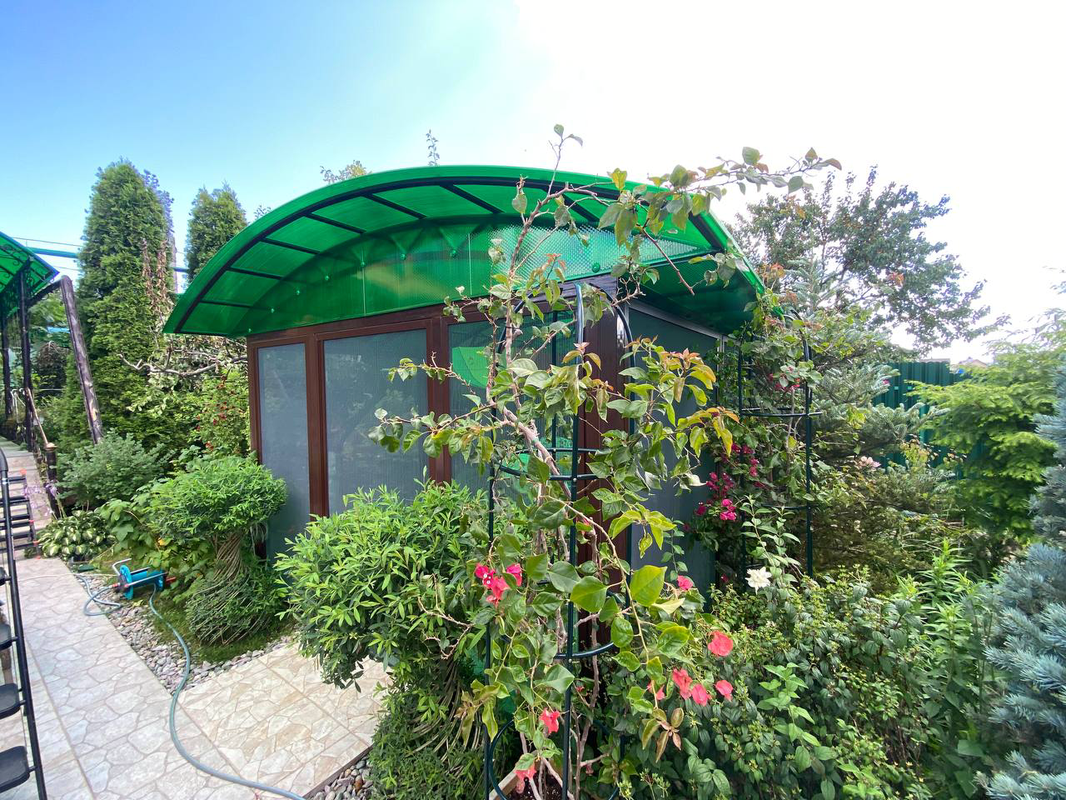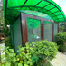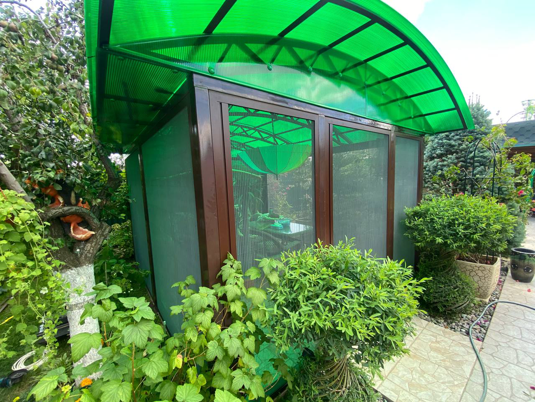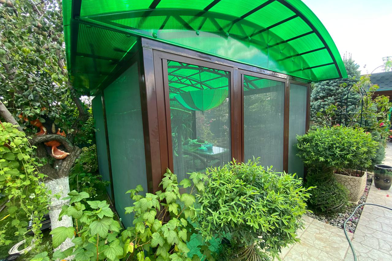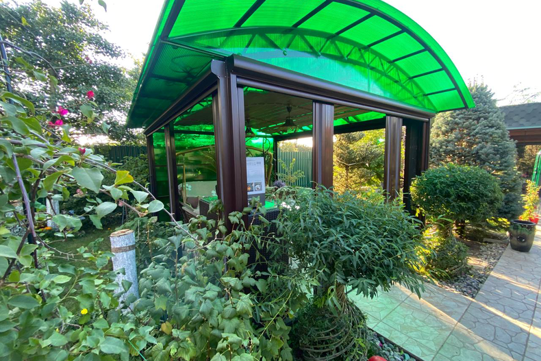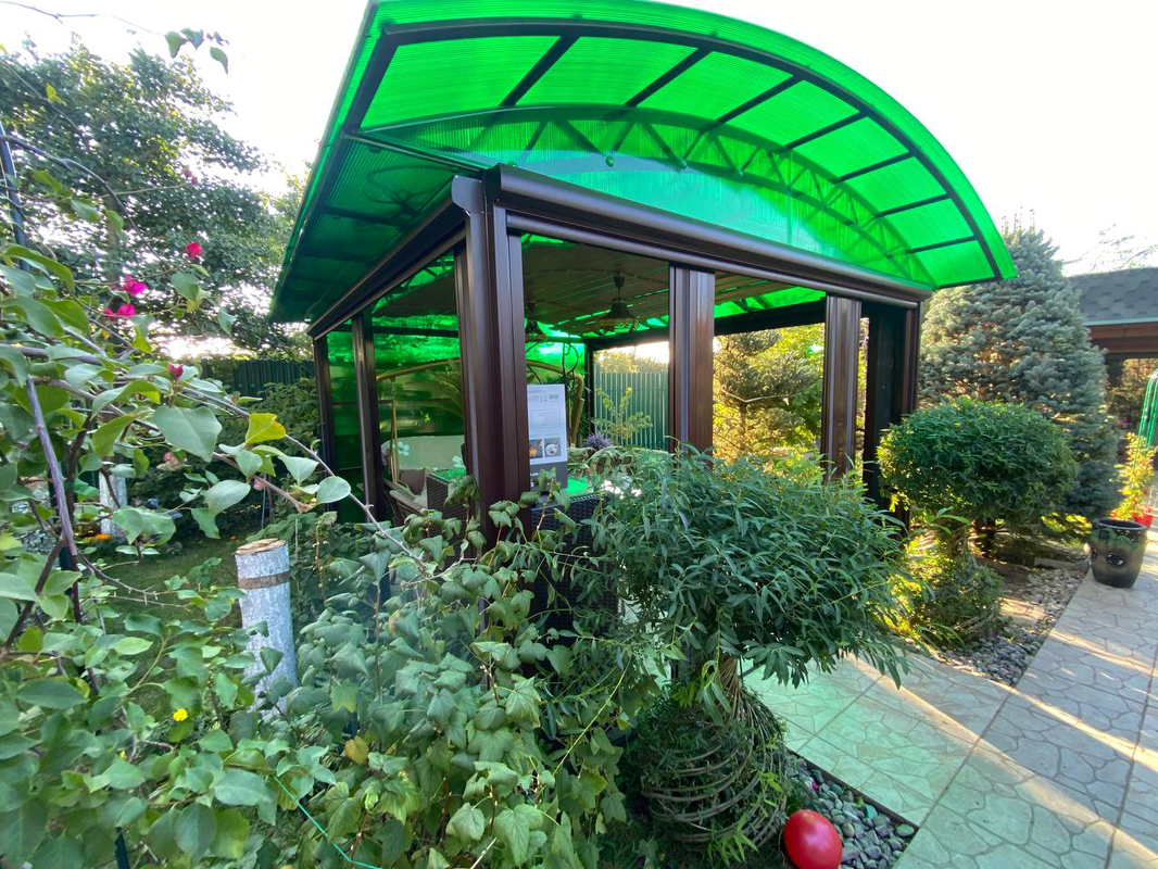 Изогнутая крыша из монолитного или сотового поликарбоната создаёт эффект лёгкости и пропускает мягкий свет, формируя приятную атмосферу.