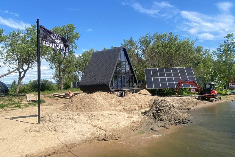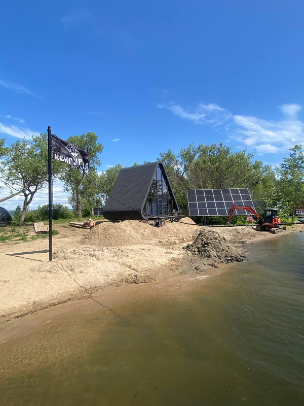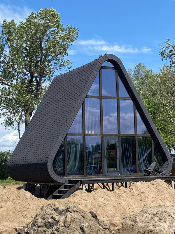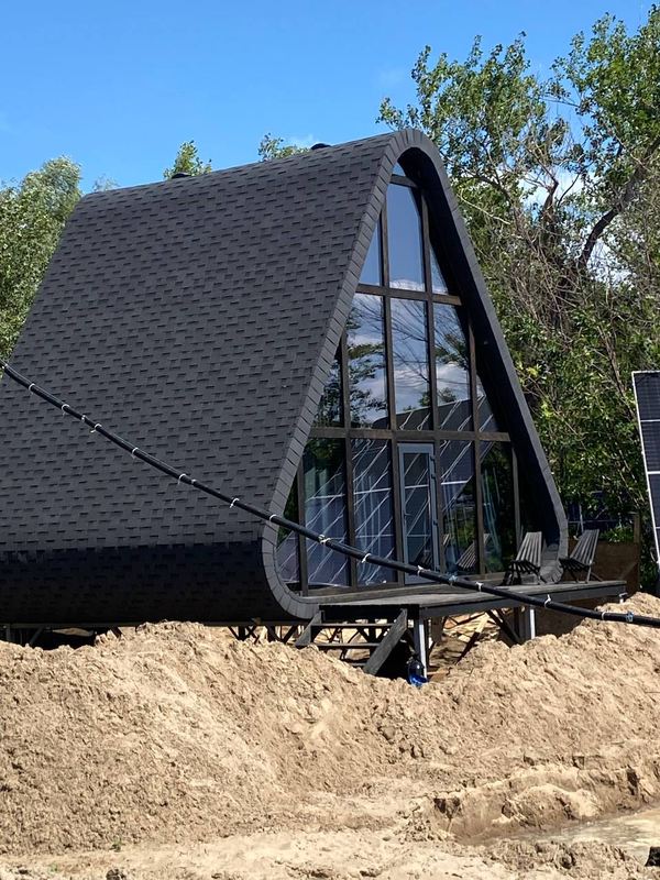 Реализовано панорамное остекление современного A-frame дома, расположенного на береговой линии. Основной акцент сделан на крупноформатный фасадный витраж, повторяющий геометрию здания и формирующий выразительный архитектурный образ.