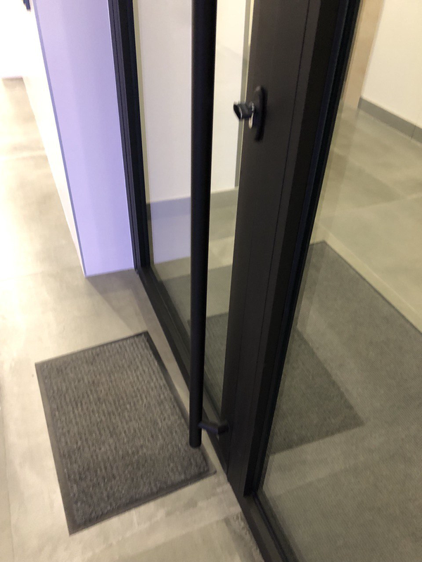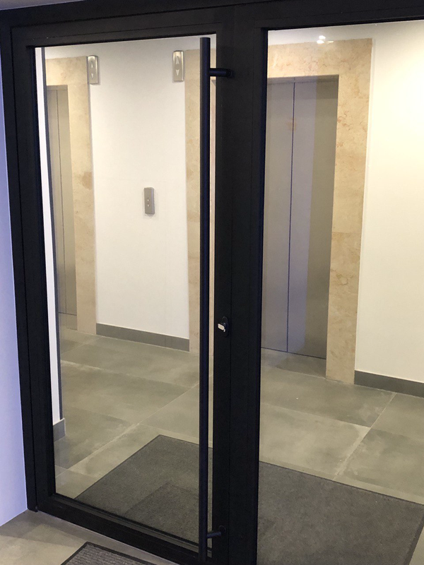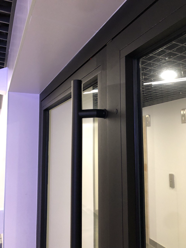 Использованы прочные стеклопакеты, рассчитанные на интенсивную эксплуатацию в общественных зонах. Вертикальная ручка-скоба добавляет выразительности и удобства при открывании. Входная группа визуально облегчает пространство и создаёт аккуратный, премиальный облик интерьера.