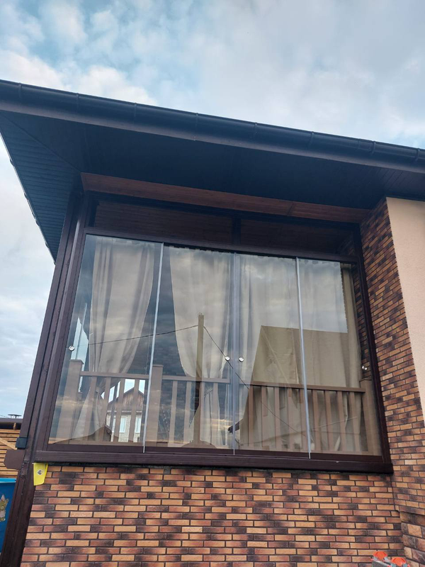Большая площадь остекления создаёт ощущение лёгкости и визуально расширяет пространство террасы. Прозрачное полотно добавляет естественного света, сохраняя защиту от осадков.