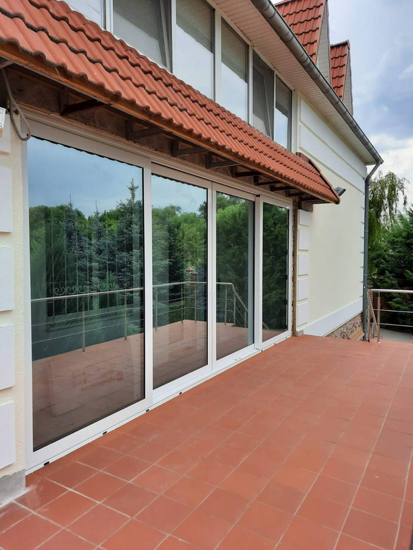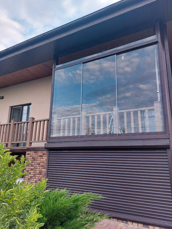 Выполнено остекление веранды частного дома с использованием раздвижных стеклянных конструкций в алюминиевом профиле.