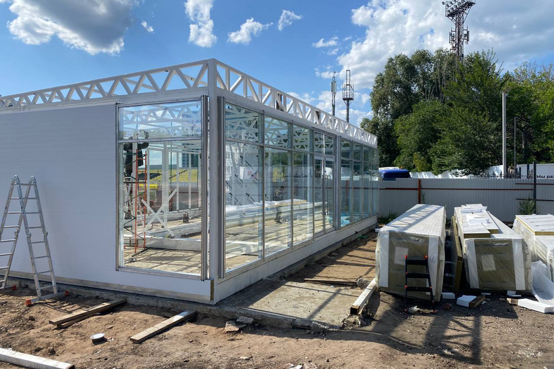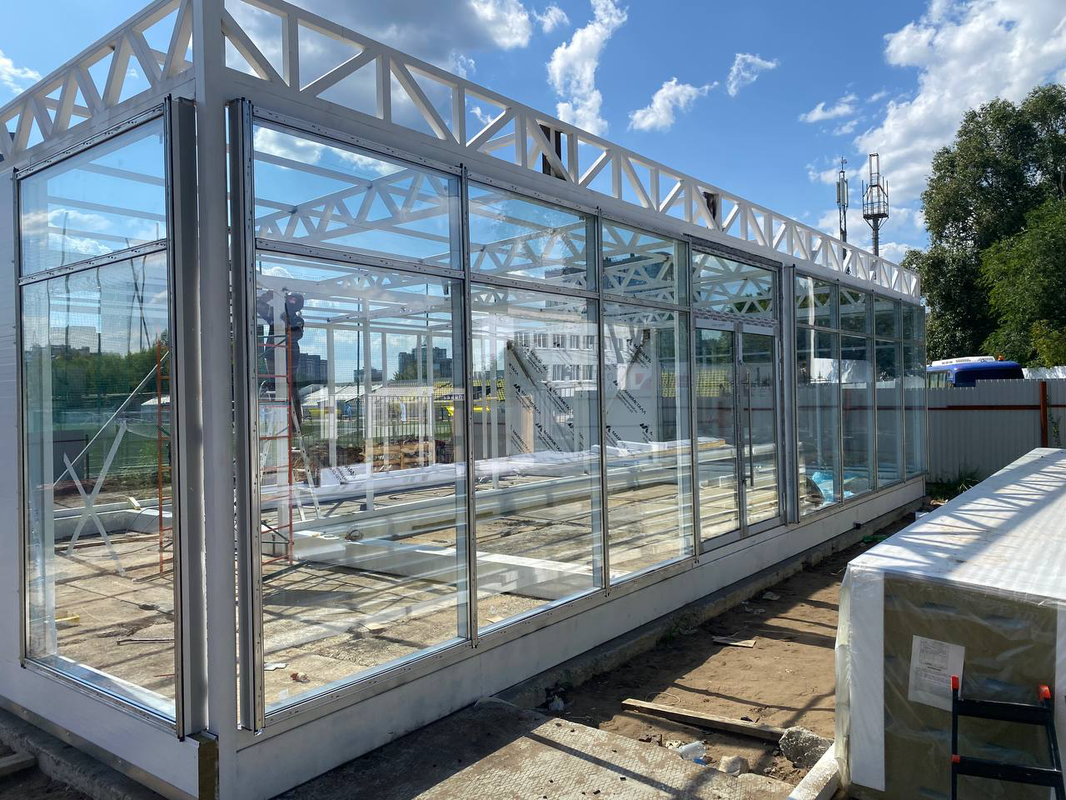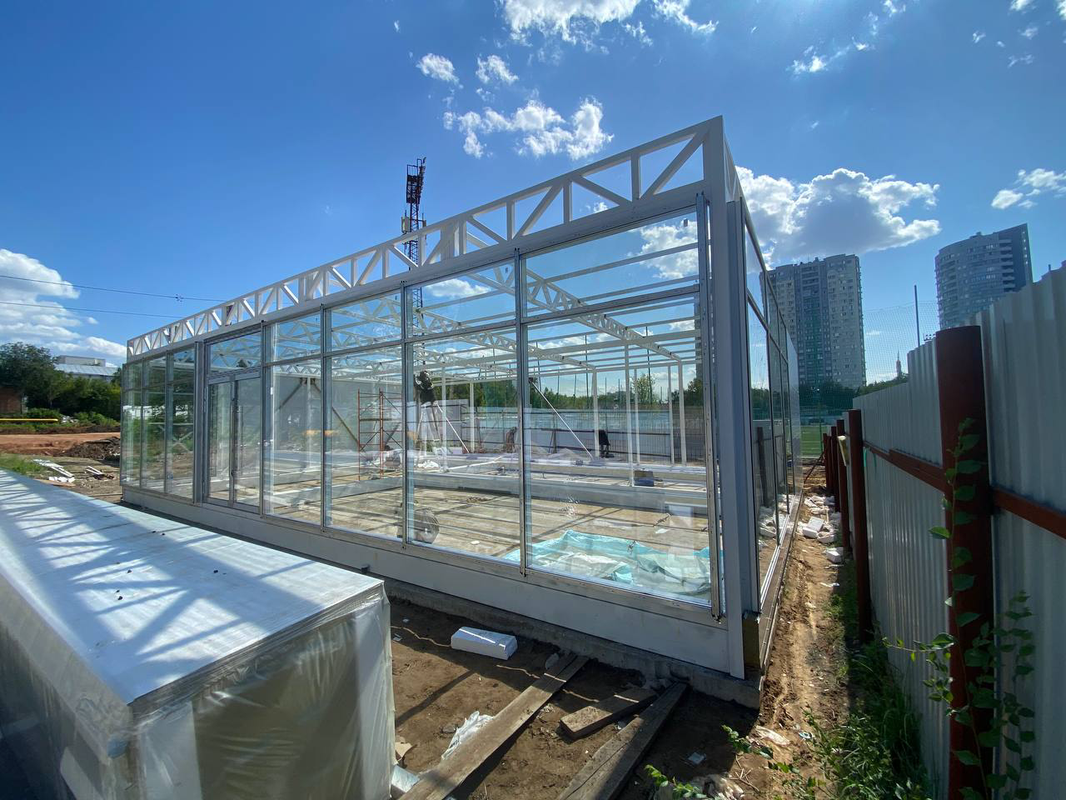 Лёгкая металлическая конструкция постепенно превращалась в полностью прозрачный объём, который буквально растворяется в окружающем пространстве. Основной задачей было создать максимально открытое помещение с большим количеством света, при этом сохранить чёткую геометрию и жёсткость каркаса. Алюминиевые рамы с крупными стеклянными заполнениями задали строгий ритм фасаду и подчеркнули современный характер объекта.