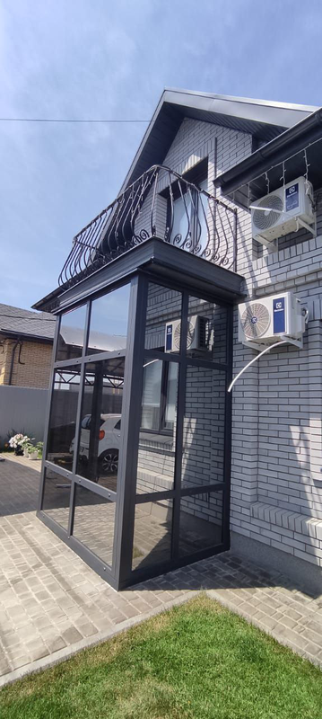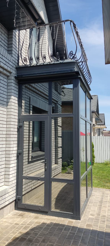 С первого взгляда эта входная зона задаёт характер всему дому - строгая геометрия, тёмный алюминиевый профиль и сплошные стеклянные плоскости формируют современный, почти архитектурный акцент. Конструкция не просто закрывает вход, а превращает его в полноценное буферное пространство между улицей и жилой частью.