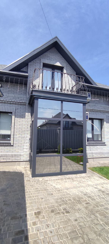 За счёт крупноформатного остекления сохраняется максимальное количество естественного света, при этом помещение защищено от ветра, осадков и перепадов температуры. Алюминиевая система обеспечивает жёсткость и стабильность конструкции, что особенно важно при такой высоте и площади стеклянных панелей. Входная группа органично встроена в фасад и подчёркивает аккуратную кладку кирпича, не перегружая внешний вид дома.