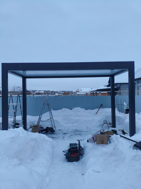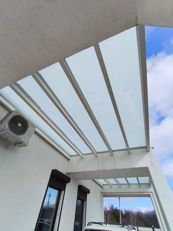Навес идеально подходит для организации террасы, парковочного места или зоны отдыха - защищает от дождя, снега, листвы и при этом не «давит» визуально. Стекло уложено на продуманную систему опор и герметизации, что обеспечивает долговечность и отсутствие протечек.