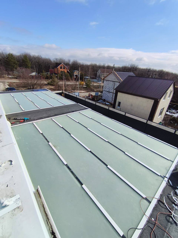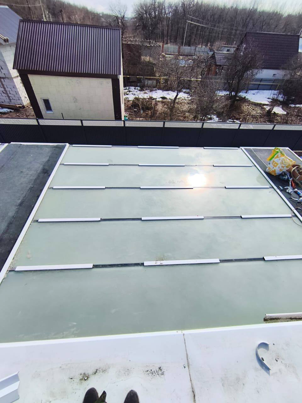 Был выполнен полный цикл работ - подготовка основания, монтаж несущего каркаса, установка стеклянных секций и герметизация примыканий к мягкой кровле.