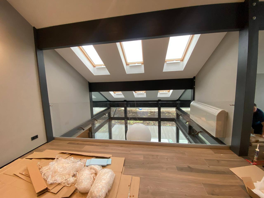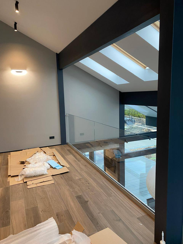 Использовано закалённое прозрачное стекло и алюминиевый профиль с минимальной видимой рамкой. Решение идеально подходит для современных интерьеров в стадии чистовой отделки и подчёркивает архитектурную геометрию помещения.