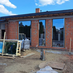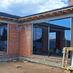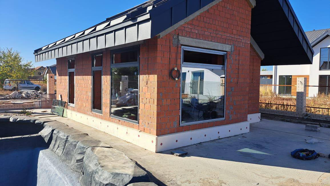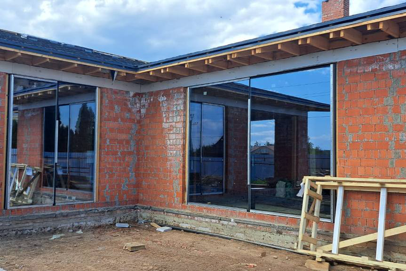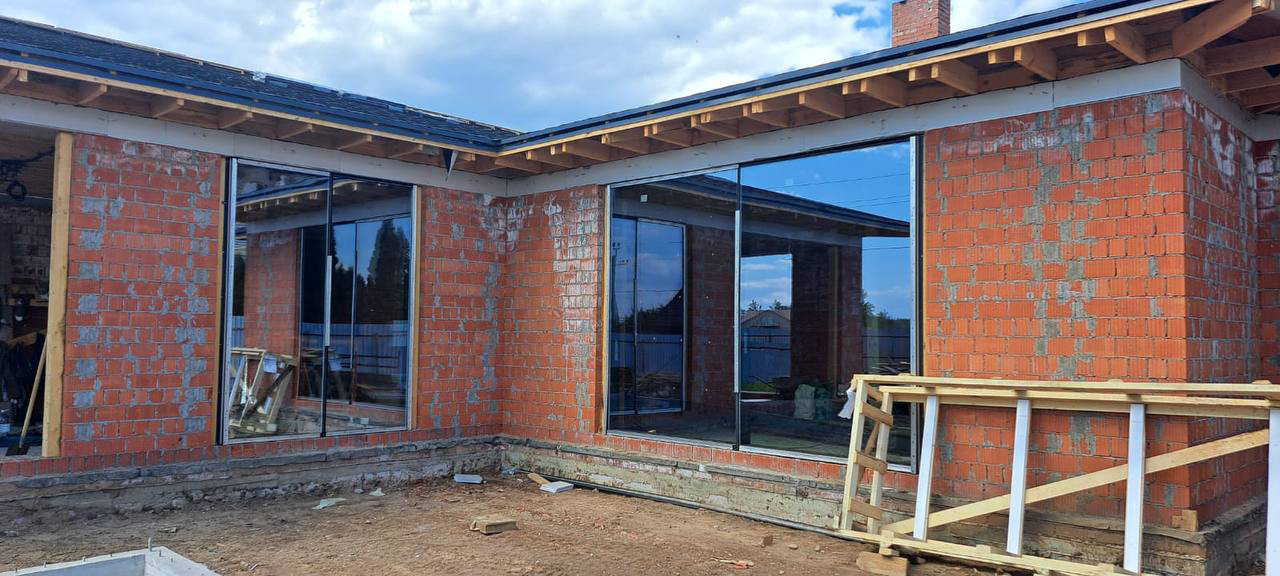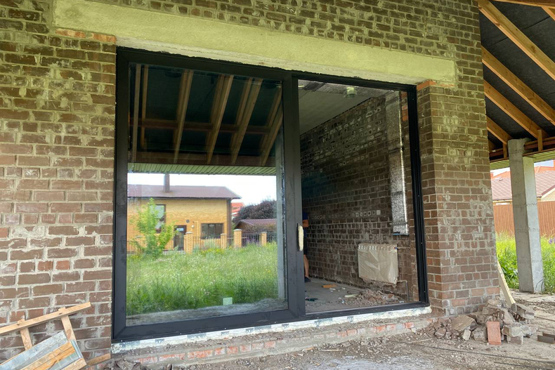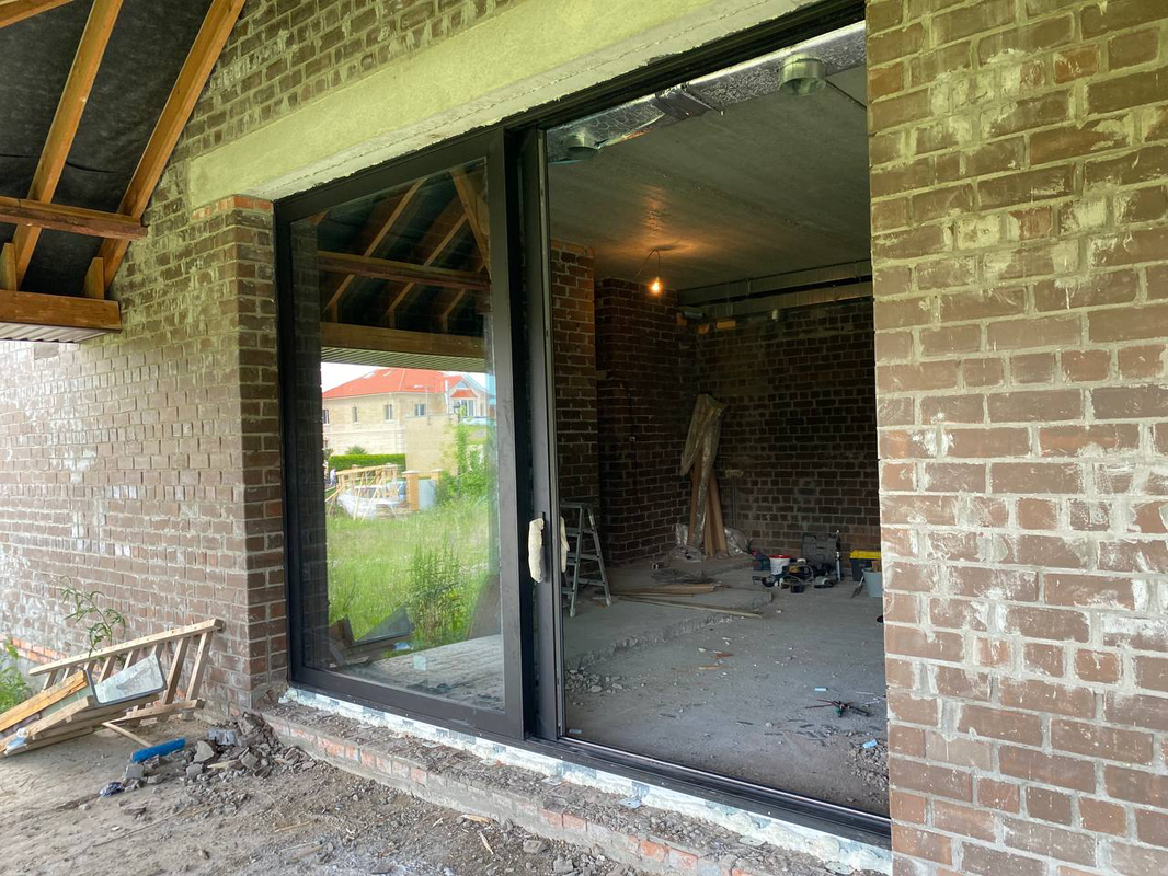 Дом еще на стадии отделки, но уже сейчас видно, как пространство начинает «работать» за счёт света. Большой проём в кирпичной стене превратился в полноценную стеклянную плоскость с раздвижной системой, которая открывает вид на участок и соединяет интерьер с улицей.