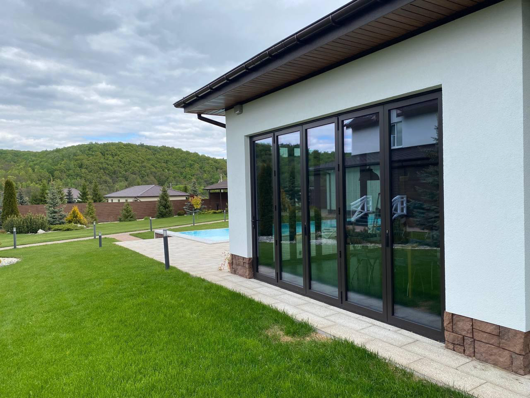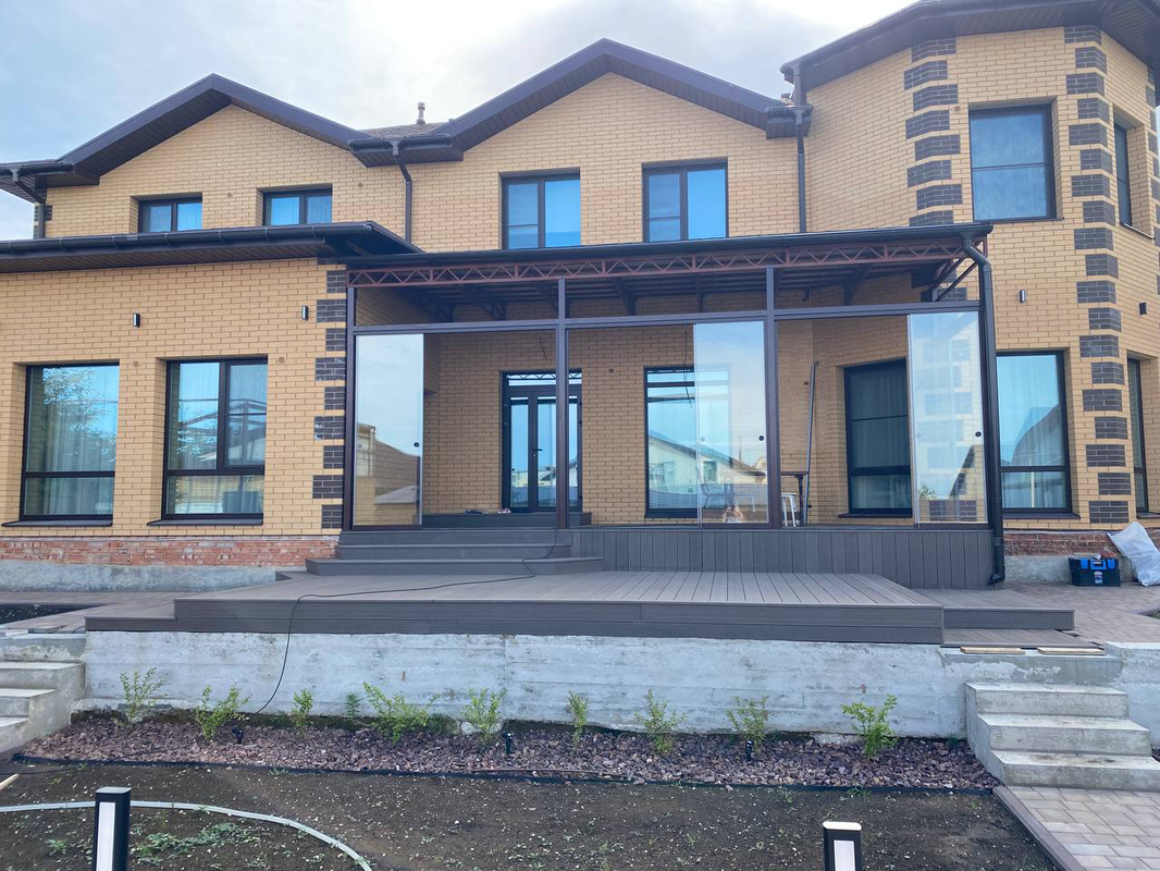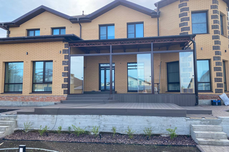 Были установлены крупноформатные стеклопакеты с раздвижной системой, которая обеспечивает лёгкое и плавное открывание даже при большом весе створок. Остекление выполнено в едином стиле по всему фасаду, что визуально объединяет террасу и основное здание, создаёт эффект цельного архитектурного решения и добавляет дому премиальный вид.