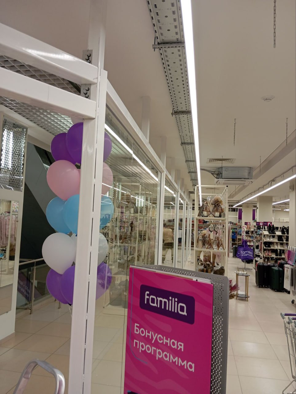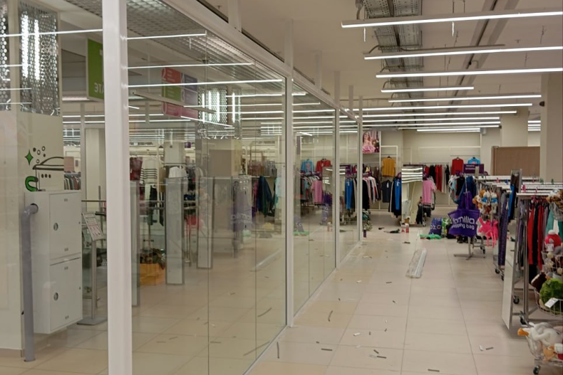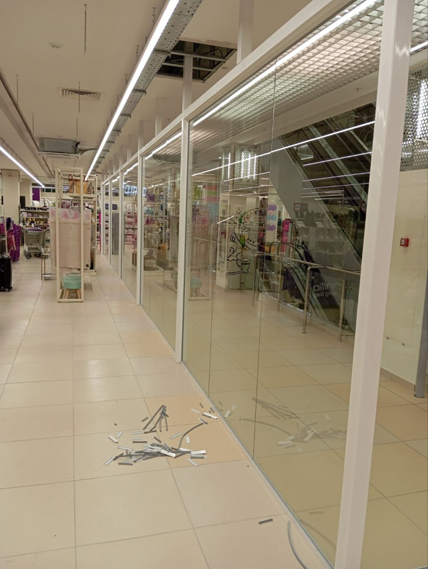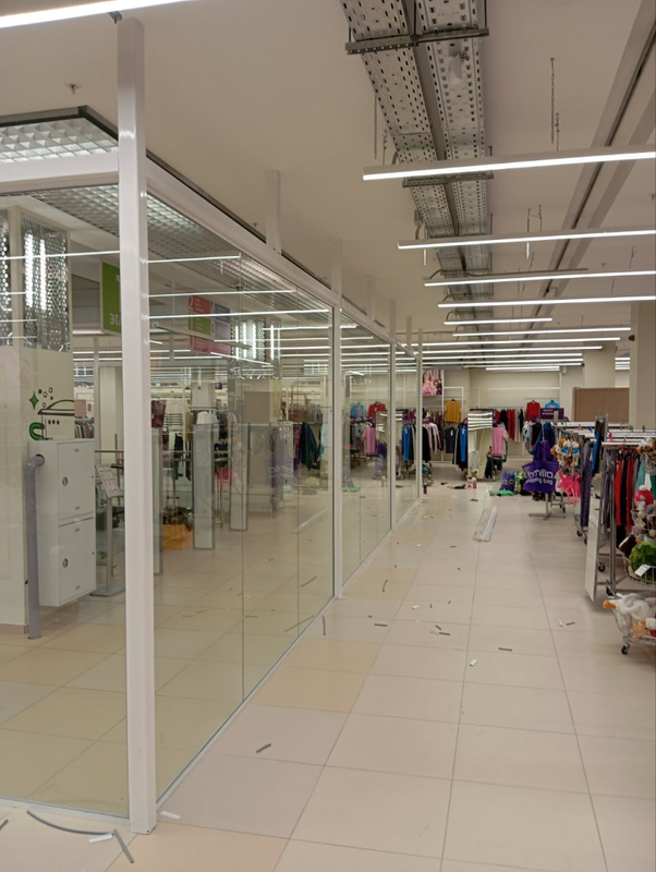Пространство торгового зала постепенно обретало структуру - не за счёт стен, а благодаря стеклу. Вдоль прохода сформирована линия бутиков, где каждая зона отделена, но при этом остаётся визуально открытой. Прозрачные перегородки создают ощущение порядка без потери масштаба помещения: свет свободно проходит через весь зал, отражаясь от витрин и усиливая глубину пространства. Конструкции аккуратно интегрированы в существующую архитектуру, повторяя ритм колонн и потолочных линий. В результате получилось решение, которое одновременно работает как функциональное зонирование и как элемент современного ритейл-дизайна.
