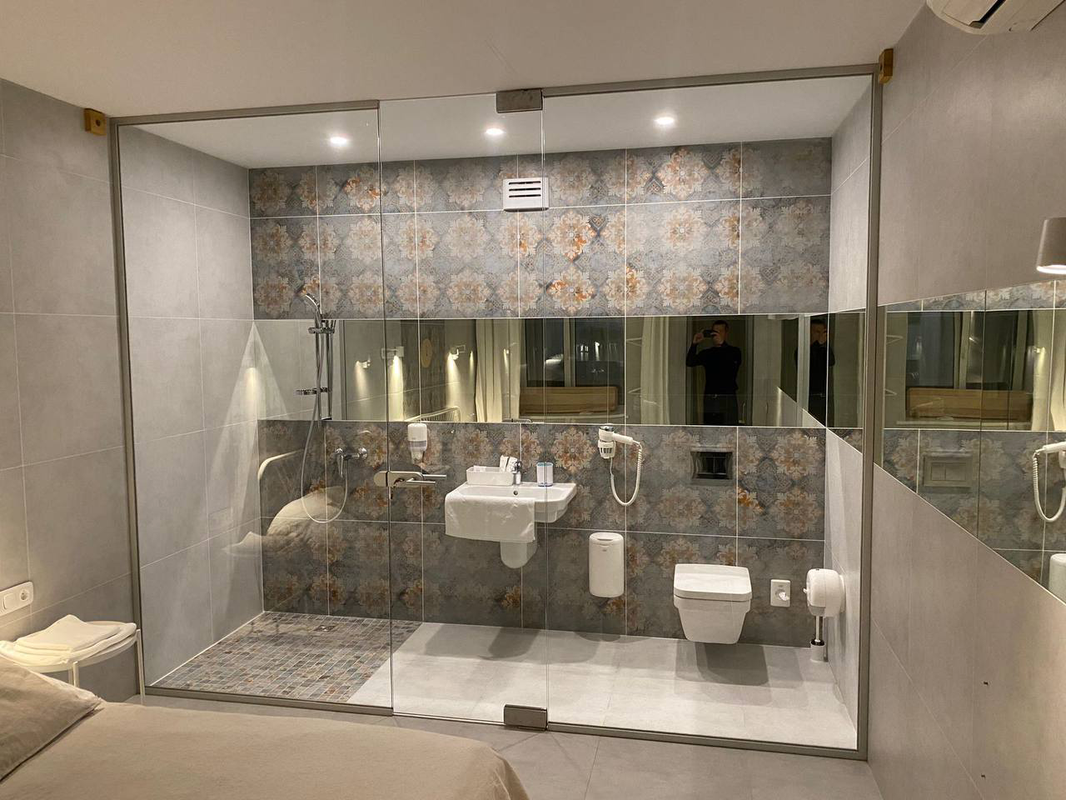 Душевая часть аккуратно вписана в общий объём комнаты, а стекло работает как визуальный фильтр: сохраняет свет, отражения и глубину пространства. За счёт минимального количества креплений и отсутствия массивных рам конструкция выглядит легко и современно. В результате получилась не просто ванная зона, а полноценный элемент интерьера, который усиливает ощущение открытости и дизайнерской целостности.