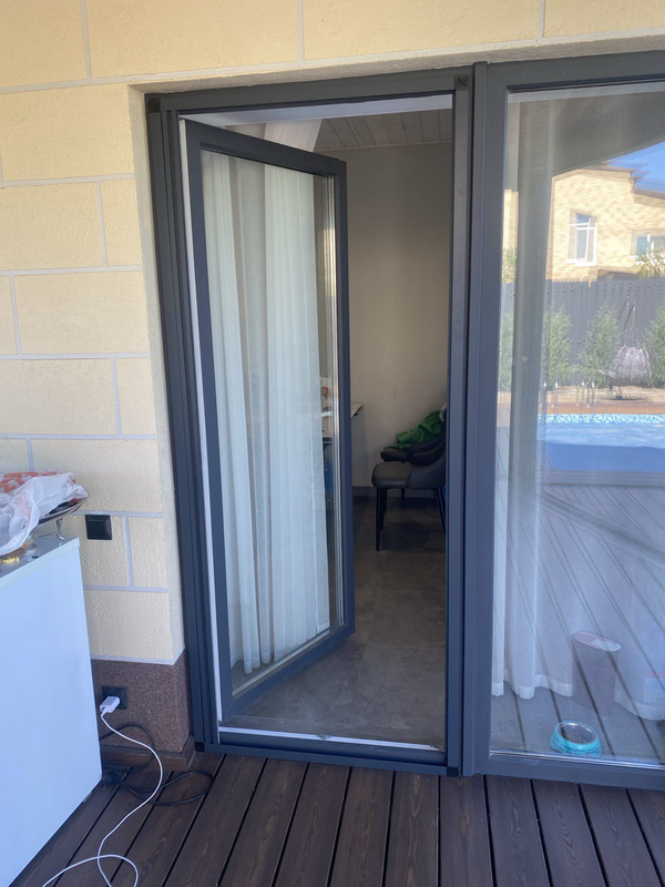 С первого взгляда это обычный выход на террасу, но в деталях скрывается продуманное решение для повседневного комфорта. Лёгкая алюминиевая дверь открывается без усилий, а сразу за ней - аккуратно встроенная плиссированная москитная система, которая не нарушает внешний вид проёма. В тёплое время года пространство остаётся открытым для воздуха и света, при этом защищённым от насекомых. Конструкция гармонично вписана в фасад и не перегружает архитектуру, сохраняя ощущение чистоты и порядка.
