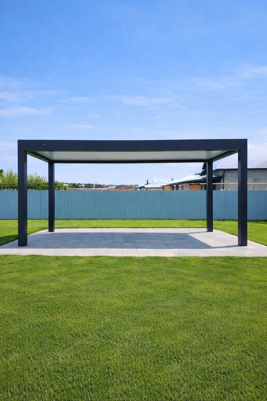 Темный профиль контрастирует с окружением и подчеркивает геометрию, а встроенная кровельная система защищает от дождя и прямых лучей. В результате получилась универсальная площадка, которую можно использовать и в жаркий день, и в прохладную погоду - для отдыха, встреч или семейных ужинов на свежем воздухе.