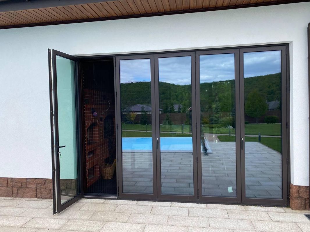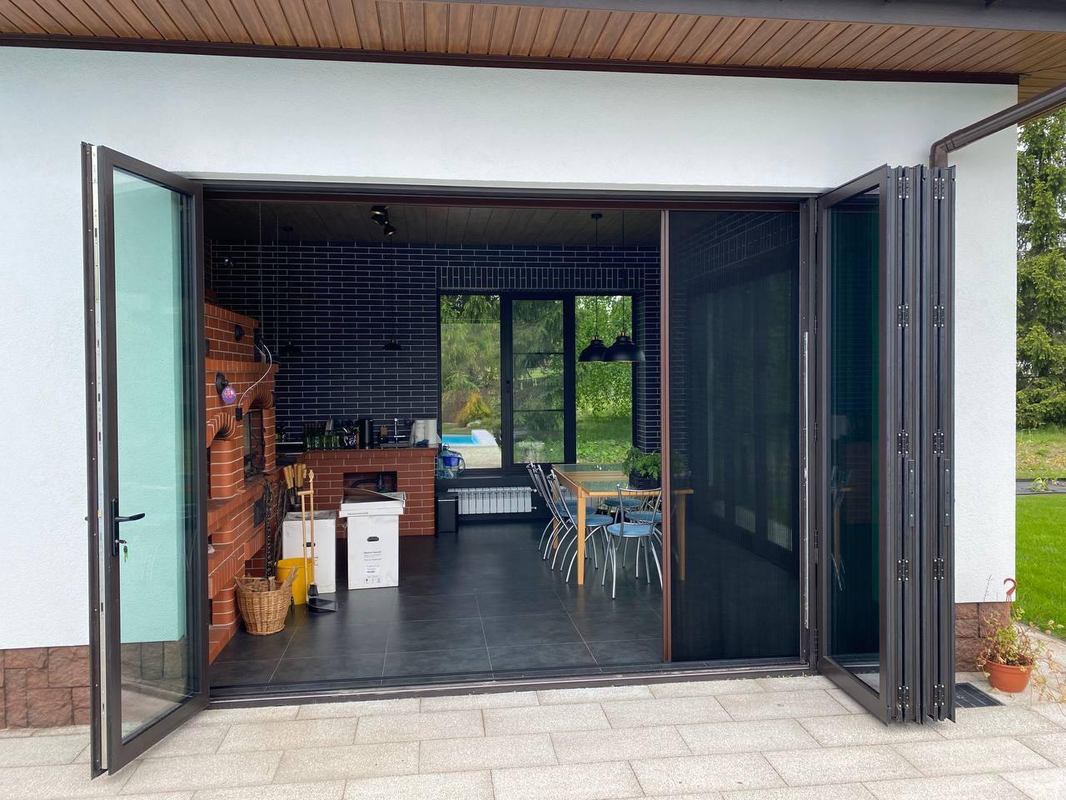 На крытой террасе частного дома выполнено раздвижное панорамное остекление, позволяющее полностью открыть или закрыть пространство при необходимости. Использованы лёгкие, прочные створки с сетками-плиссе - они обеспечивают комфортное проветривание без насекомых и сохраняют прозрачность вида на участок.
