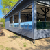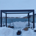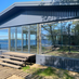 По периметру установлены большие стеклянные раздвижные панели, создающие максимальный обзор и визуальное единство с участком. Остекление защищает от ветра, осадков и холода, сохраняя естественное освещение и ощущение открытого пространства. Решение подходит для круглогодичного использования - как зоны отдыха, так и гостевого пространства.