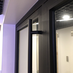 Оформление входной зоны выполнено с применением алюминиевой двери и панорамного остекления. Конструкция подчёркивает современную архитектуру пространства за счёт чётких линий, тёмного профиля и максимальной прозрачности.