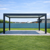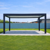 Современная садовая беседка, полностью интегрированная в ландшафтный дизайн участка. Конструкция выполнена на базе прочного алюминиевого каркаса с панорамным остеклением, что обеспечивает максимальную обзорность и естественное освещение. Прозрачные панели позволяют наслаждаться садом в любое время года, оставаясь в уютном и защищённом пространстве.