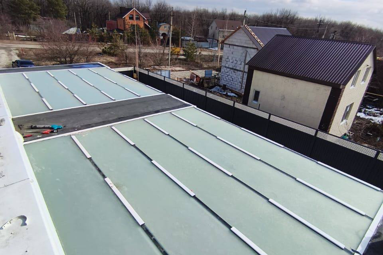 Особое внимание было уделено гидроизоляции примыканий, выравниванию посадочных мест и герметичности узлов - работы велись в условиях готовой кровли.